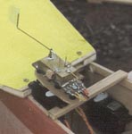 Nach der Landung durchdachte ich noch einmal in Ruhe den Ablauf der Steuerreaktion und kam zu folgender Erkenntnis: Da die Spreizklappe beim Kurvenflug faßt vollständig geöffnet war, heißt daß, der Nurflügel flog mit ca 25° Schiebewinkel, denn dieser Wert ergibt sich aus der Einstellung des Sensors. Interessant dabei ist, daß dies visuell absolut nicht zu erkennen war. Daraus ergibt sich auch eine Erklärung für das träge Steuerverhalten : Beim Einleiten einer Kurve dreht sich der Flügel erst gegen die gewünschte Kurvenrichtung ehe sich durch Öffnen der Spreizklappe das Kräfteverhältnis verschiebt. Für Brettnurflügel mit Seitenleitwerk gilt das Gleiche: die viel zu kleinen Seitenleitwerke, die zudem noch am kurzen Hebel arbeiten, können erst bei sehr großen Anstellwinkel wirkungsvoll dem negativen Wendemoment entgegentreten. Nach dieser Feststellung galt es also, eine Drehung gegen die Kurvenrichtung, beim Einleiten einer Kurve zu verhindern. Zu diesem Zweck montierte ich den Sensor auf ein Servo, welches mit dem Querruder gemischt ist und somit beim Einleiten einer Kurve die Grundachse verstellt.