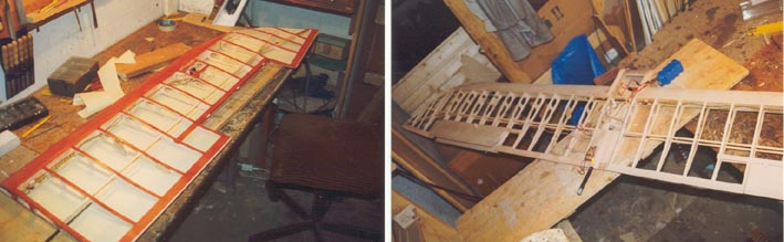 Gesagt gatan, also ging es ans Werk. Ein einfacher Brettnurflügel wurde für diese Steuerung konstruiert. ( die Funktion der Quer/ Höhenruder - Spreizklappe habe ich bereits im Kapitel über den neuen GFK-Saurier beschrieben) Hier einige Bilder der Bauphase: