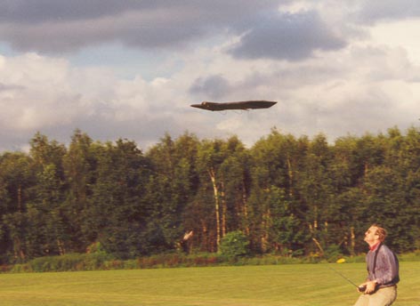 Noch mit Seitenleitwerk u. deaktivierten Sensor Der erste Flugversuch verlief völlig problemlos, so daß ich den zweiten Versuch mit gekürzten Leitwerk und aktiven Sensor wagte.